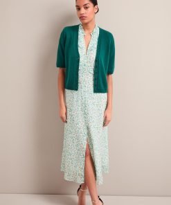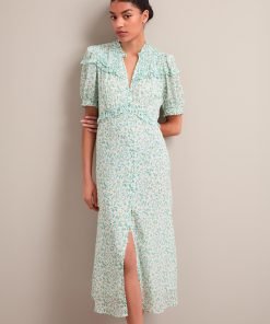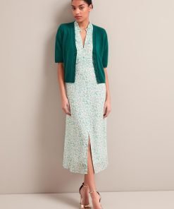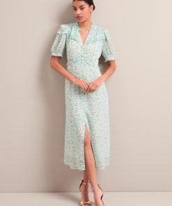 Viola Gold Metallic Fil Coupé Midi Dress – Green Yellow Trailing Feather Print