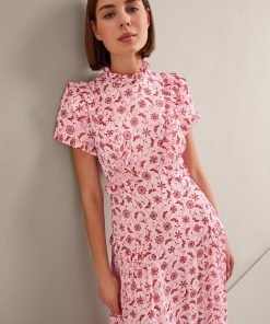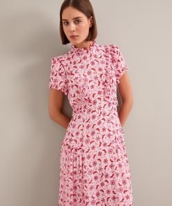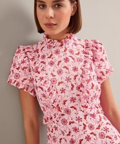 Mirabel Gold Metallic Fil Coupé Maxi Dress – Pink Floral Trellis Print